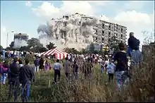 On Sunday 12 September 1993, Glasgow City Council invited local people and the media to witness the 'blowdown' of the blocks at noon. The public viewing area was placed too close to the building and debris hit the crowd, killing 61-year-old Helen Tinney who lived locally and injuring four others. Miles Glendinning and Stephen Muthesius's book Tower Block published the following year expressed the hope that it might also have "dealt a fatal blow to that most conspicuous ritual of Anti-Modernism–the demolition of tower blocks as public theatre".[13] The inquiry into the accident revealed that the demolition contractor had used twice the amount of explosive necessary to fell the structures – no explosive demolition of a tower block was carried out in Glasgow for another 10 years, partly as a consequence.