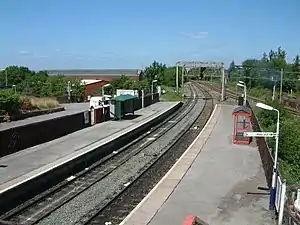 Hyde North only has platforms on the non-electrified tracks towards New Mills Central. The electrified tracks carry EMU trains from Manchester Piccadilly to Glossop and Hadfield behind the station. Despite the station's former name, Hyde Junction, suggesting that passengers had a choice of routes, there never were platforms on the Glossop/Hadfield line here; trains call instead at nearby Flowery Field.