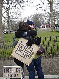 Hyde Park's Speakers' Corner has acquired an international reputation for demonstrations and other protests[61] due to its tolerance of free speech.[62] In 1855, a protest at the park was organised to demonstrate against Robert Grosvenor's attempt to ban Sunday trading, including a restriction on pub opening times. Karl Marx observed approximately 200,000 protesters attended the demonstration, which involved jeering and taunting at upper-class horse carriages. A further protest occurred a week later, but this time the police attacked the crowd.[63]