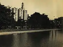 It was won by architect, planner, landscape designer and engineer Norman Weekes (1888-1972) with a finely delineated design drawn by young architect Raymond McGrath (1903–77) and influenced by the "City Beautiful" movement.[13] This design evolved with the active criticism of the assessors, architect and town planner John (later Sir) Sulman, architect Alfred Hook (Associate Professor of Construction, Architecture Faculty, Sydney University) and Town Clerk (and closely involved in the park's management) W. G. Layton, who wrote a masterly report assessing the design, pointing out its shortcomings and enunciating the design philosophy followed. Landscape historian Georgina Whitehead describes Weekes' design as an accomplished melange of modern City Beautiful, Beaux Artes and Art Deco inspiration.[38][1]