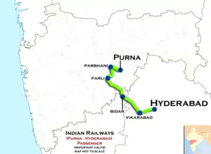 Hyderabad - Purna Passengerr is a passenger train belonging to South Central Railway zone that runs between Hyderabad Deccan and Purna Junction. It is currently being operated with 57547/57548 train numbers on a daily basis.[1][2][3]