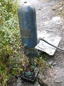 A ram newly placed into operation or which has stopped cycling should start automatically if the waste valve weight or spring pressure is adjusted correctly, but it can be restarted as follows:[17] If the waste valve is in the raised (closed) position, it must be pushed down manually into the open position and released. If the flow is sufficient, it will then cycle at least once. If it does not continue to cycle, it must be pushed down repeatedly until it cycles continuously on its own, usually after three or four manual cycles. If the ram stops with the waste valve in the down (open) position it must be lifted manually and kept up for as long as necessary for the supply pipe to fill with water and for any air bubbles to travel up the pipe to the source. This may take some time, depending on supply pipe length and diameter. Then it can be started manually by pushing it down a few times as described above. Having a valve on the delivery pipe at the ram makes starting easier. Closing the valve until the ram starts cycling, then gradually opening it to fill the delivery pipe. If opened too quickly it will stop the cycle. Once the delivery pipe is full the valve can be left open.