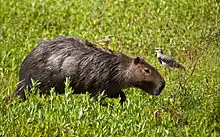 | H. hydrochaeris with a cattle tyrant on its back | |