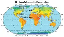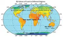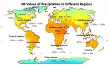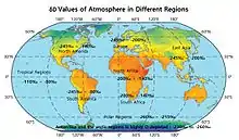 The δD values of the annual precipitation in different regions of the world are shown on the map.[65] The precipitation is more D-enriched near the equator in the Tropical regions. The values of δD generally fall in the range of around −30~-150‰ in the northern hemisphere and −30~+30‰ over the land areas of the southern hemisphere. In North America, the δD values of average monthly precipitation across regions are more negative in January (ranging up to around −300‰ in Canada) compared to July (up to around −190‰).[65]