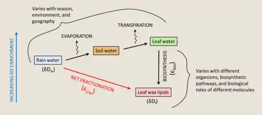 In biogeochemistry, scientists focused primarily on the stable isotope of deuterium as a tracer for environmental processes, especially the water cycle. The American geochemist Harmon Craig, once a graduate student of Urey's, discovered the relationship between rainwater's hydrogen and oxygen isotope ratios. The linear correlation between the two heavy isotopes is conserved worldwide and referred to as the Global Meteoric Water Line.[20] By the late 1960s, the focus of hydrogen isotopes shifted away from water and towards organic molecules. Plants use water to form biomass, but a 1967 study by Zebrowski, Ponticorvo, and Rittenberg found that the organic material in plants had less deuterium than the water source.[21] Zebrowski's research measured the deuterium concentration of fatty acids and amino acids derived from sediments in the Mohole drilling project. Further studies by Bruce Smith and Samuel Epstein in 1970 confirmed the depletion of deuterium in organics compared to environmental water.[22] Another duo in 1970, Schiegl and Vogel, analyzed the composition of hydrogen isotopes as water became biomass, as biomass became coal and oil, and as oil became natural gas.[23] In each step they found deuterium further depleted. A landmark paper in 1980 by Marilyn Epstep, now M. Fogel, and Thomas Hoering titled "Biogeochemistry of the stable hydrogen isotopes" refined the links between organic materials and sources.[24]