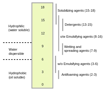 The hydrophilic-lipophilic balance of a surfactant is a measure of the degree to which it is hydrophilic or lipophilic, determined by calculating values for the different regions of the molecule, as described by Griffin in 1949[1] and 1954.[2] Other methods have been suggested, notably in 1957 by Davies.[3]