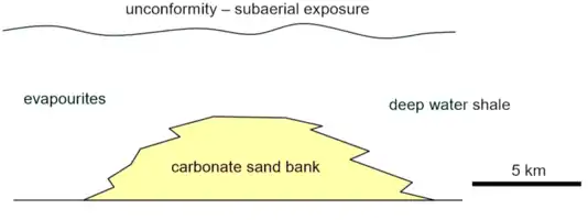 The deposits are hosted in limestone or dolomite that was deposited on shallow marine platforms in a tectonically stable intraplate environment. As expected in such an environment, volcanic rocks, folding and regional metamorphism are absent as a general rule. MVT deposits commonly lie in close proximity to evaporites and/or beneath unconformities.[42]