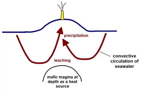 The sea water is heated, convection currents are formed and they ascend carrying the minerals which are discharged at the bottom of the sea or immediately below the surface in the form of black smokers.[36]