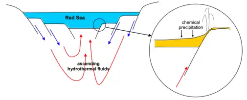 SEDEX deposits form in sedimentary basins under a regional tectonic extensional environment, under the ocean where cold seawater (blue arrows) is mixed with basin water and through sinsedimentary faults flow towards the bottom of the basin, which are heated by the geothermal gradient, and later ascends by convective currents (red arrows).[41]
