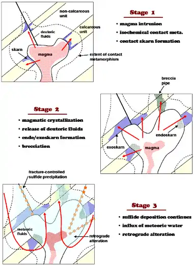 Skarn formation, as illustrated in the figure on the right, can be explained in three stages:[25]
