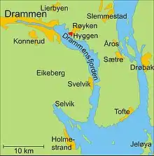 Hyggen is a coastal village located along the east side of Drammensfjord. Hyggen is 4 km from Røyken, 13.7 km from Drammen and 40.6 km from Oslo. The village had 739 residents as of 1 January 2014. Hyggen was previously best known for its granite quarry. Today it is most associated with the cultivation of fruits and berries. Hyggen has both a marina and a beach. It offers short distances to recreational areas, as well as the hiking trails. [1] [2] [3]