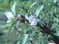 The flowers have white to purple corollas with either 5 equal lobes or 2 lips. A lipped corolla has an erect, concave upper lip with two lobes, and a lower lip with 3 lobes. The flower has four stamens. Two may be staminodal, lacking pollen. The individual filaments of the stamens are united into pairs by a membrane. There is an inconspicuous nectar disc. Each flower yields at least 6 seeds.[6]