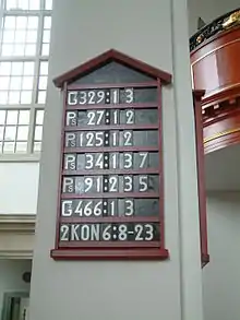 A hymn board is a board in a church building that lists the hymns that will be sung during the service. Normally, the hymns are indicated by the number under which the hymn appears in the church's hymnal. The display of hymn numbers in this way can allow the congregation to bookmark the relevant pages of the hymnal in advance, to make it easier to worship during the service.[1] Hymn numbers may also be printed on a notice sheet distributed before the service.[2]
