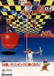 Hyper Sports, known in Japan as Hyper Olympic '84,[3] is an Olympic-themed sports video game released by Konami for arcades in 1984. It is the sequel to 1983's Track & Field and features seven new Olympic events. Like its predecessor, Hyper Sports has two run buttons and one action button per player. The Japanese release of the game sported an official license for the 1984 Summer Olympics.