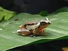 The female holotype measures 31 mm (1.2 in) in snout–vent length and the male paratype 25 mm (0.98 in).[3] Typically, males measure 23–27 mm (0.91–1.06 in) and females 25–32 mm (0.98–1.26 in) in snout–vent length.[4][5] There are two distinct colour phases, "J" and "F". Juveniles and many mature males have phase J whereas mature females and some mature males have phase F. Phase J has a brownish dorsum with diffuse darker spots. Phase F has a darker dorsum, or lighter brown with diffuse darker spots, and broad, black-edged silverish canthal and dorsolateral lines. Ventrum is yellow to orange for both phases.[4]