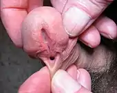 Hypospadias can be a symptom or indication of a difference in sex development[11] or an intersex condition, but some consider that the presence of hypospadias alone is not enough to classify someone as a person with a difference/variation in sex development or as intersex. In most cases, hypospadias is not associated with any other condition.[12] Hypospadias is however itself recognized as an intersex condition by several intersex rights activist groups, who consider the repositioning of a working urethra on a child too young to consent to be a human rights violation.[13][14][15]