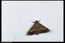 The wingspan is 36–44 mm.[2] Male with ciliated antennae. Cell of hindwings short. Veins 7 and 8 distorted and vein 6 given off below angle of cell. Body much darker red-brown. Palpi black with white tips. Forewings with reniform reduced to a pale speck. The postmedial line less oblique, arising from the costa before apex, and not angled. Hindwings with straight postmedial line.[3]