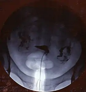 ![]() A normal hysterosalpingogram. Note the catheter entering at the bottom of the screen, and the contrast medium filling the uterine cavity (small triangle in the center). | |