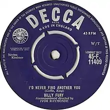 Fury had previously covered an Orlando song, also written by Goffin and King, "Halfway to Paradise", which was also a top-five hit.[3] "I'd Never Find Another You" was Fury's final single of 1961, released for Christmas. The B-side, "Sleepless Nights", was written by Buck Ram and had been released by former Platters lead singer Tony Williams as a single in August 1961.[5] Both sides are backed by an orchestra directed by Ivor Raymonde.