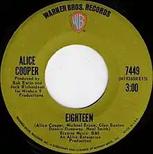 "I'm Eighteen" is a song by rock band Alice Cooper, first released as a single in November 1970 backed with "Is It My Body". It was the band's first top-forty success—peaking at number 21—and convinced Warner Bros. that Alice Cooper had the commercial potential to release an album. The song and its B-side feature on the band's first major-label album Love It to Death (1971).