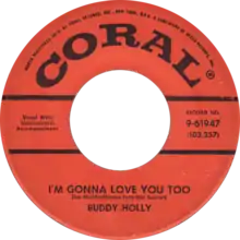 Holly included the song on his self-titled second album, Buddy Holly.[7] It was released as a single on Coral Records, but failed to crack the Billboard Hot 100. (Buddy Holly continued to sell regionally in the upper midwest after his death and when it rereleased, "I'm Gonna Love You Too" was a substantial 'regional' hit in Minneapolis and surrounding markets in 1964.)