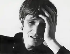 I'm too sad to tell you (1970–71) is a mixed media artwork by conceptual artist Bas Jan Ader.[2] The work includes a three-minute black-and-white silent film, still photographs and a post card all related to him crying for an unknown reason. The photographs include both a short hair version and a long hair version.[3] The post cards were mailed to his friends with the inscription “I'm too sad to tell you”.[4] There was an original, now lost, version of the film called Cry Claremont. It was shown in the Pomona College Gallery in Claremont, California in 1971-72.[5]