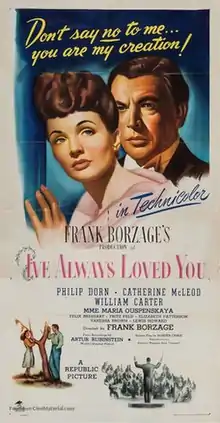 I've Always Loved You is a 1946 American Technicolor drama film produced and directed by Frank Borzage and written by Borden Chase. The film stars Philip Dorn, Catherine McLeod, William Carter, Maria Ouspenskaya, Felix Bressart and Elizabeth Patterson.[3][4][5] Rare for a film produced by Republic Pictures, I've Always Loved You is a high-budget prestige production with an A-list director in Borzage.[6]