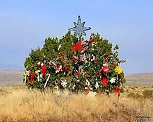 The 20-foot-tall (6.1 m) one-seed juniper (Juniperus monosperma)[3] tree has been decorated annually for over 30 years[4] and is famous around the state.[5] Unlike a traditional Christmas tree, it is actually shaped like a bush, being nearly as wide as it is tall.[6] Decorations include Christmas ornaments, tinsel and garland,[4] stuffed animals, bows, flags, and it is topped with a silver star.[2] The tree is at a point where the terrain necessitated a wide separation between the northbound and southbound lanes of I-17, and the median is over 100 feet (30 m) wide. The median is under the jurisdiction of the Arizona Department of Transportation (ADOT), who have said "that for years, no one has been able to figure out who is responsible".[5] The tree is surrounded by four water storage barrels and plastic drip tubing to supplement the sparse natural rainfall in the area.[7] The irrigation system is also believed to have been installed by the unknown tree decorators.[5] In 2013, ADOT spokesman Doug Nintzel said people have told him that they know who is responsible but have not said who it is.[7]