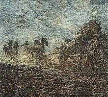 During her career, she both signed her work and authenticated it by a thumb print in the back of the canvas.[2] Hess' Bertisme technique, named as such by the influential British art critic Peter Fuller, involved the "sculpting" by brush of great quantities of oil paint on canvas.[3] As a result, the surface on most paintings by Hess are about two inches thick and took up to several years to dry.[3] When seen up-close, the surface appears as a labyrinth of colour and light trapped in thick tunnels of paint and, when viewed from a certain distance, Hess' scenes progressively emerge from the canvas.[3] The biggest paintings would take her a year to complete and seven years to dry.[4]