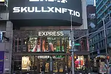 TGI Fridays closed in early 2012,[65] and clothing retailer Express signed a lease for the storefront that May.[66][67] Rogers Marvel Architects was subsequently hired to restore the building.[68] The statues in the niches were subsequently removed for restoration in 2012, and SNA replaced the existing signs with a group of seven screens.[8] The facade was also restored.[15] Since the landmark designation prevented SL Green and Wharton from adding stories to 1552 Broadway, they leased 1560 Broadway and 155 West 46th Street, connecting the buildings internally.[62][69] This arrangement allowed the owners to triple the size of the retail space without actually expanding 1552 Broadway.[62] The restoration of 1552 Broadway was completed in 2014,[8] and the Express store soft-opened that February.[23][24] The owners acquired a $195 million loan for 1552 and 1560 Broadway from United Overseas Bank in 2017.[70]
