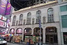 The current building was adapted from a pair of four-story brownstone tenements at 1552 and 1554 Broadway.[7] The surrounding area is part of Manhattan's Theater District and contains many Broadway theatres.[2] The building is surrounded to the north and east by the Actors Equity Building at 1560 Broadway.[8] Immediately to the north are TSX Broadway at 1568 Broadway, containing the Palace Theatre, as well as the Embassy Theatre within 1560 Broadway.[3][9] Other nearby buildings include the Church of St. Mary the Virgin to the east; 1540 Broadway and the Lyceum Theatre to the south; the New York Marriott Marquis to the southwest; the Lunt-Fontanne Theatre and Hotel Edison to the west; and the Morgan Stanley Building to the northwest.[3]