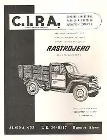 The Rastrojero is a small utility pickup truck (taxis were also developed) with a capacity of half-ton designed by Raúl Gómez and built by the Argentine government-owned airplane (and vehicle) manufacturer IAME (Industrias Aeronáuticas y Mecánicas del Estado) from 1952 to 1980. It owes its name to its purpose of being driven on crop residue (rastrojos). Over 33,000 of these trucks were manufactured.[1]