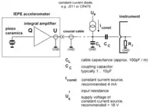 Most IEPE sensors work at a constant current between 2 and 20 mA. A common value is 4 mA. The higher the constant current the longer the possible cable length. Cables of several hundred meters length can be used without a loss of signal quality. Supplying the IEPE sensor with constant current, results in a positive bias voltage, typically between 8 and 12 volts, at the output. The actual measuring signal of the sensor is added to this bias voltage.[1][2][3] The supply or compliance voltage of the constant current source should be 24 to 30 V which is about two times the bias voltage. This ensures maximum amplitudes in positive and negative direction.