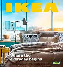 The IKEA Catalogue (US spelling: IKEA Catalog; Swedish: Ikea-katalogen) was a catalogue published annually by the Swedish home furnishing retailer IKEA. First published in Swedish in 1951,[1] the catalogue was considered to be the main marketing tool of the company and, as of 2004, consumed 70% of its annual marketing budget.[2] Approximately 208 million copies of the catalogue were printed in fiscal year 2013, more than double the number of Bibles expected to be printed in the same period.[3]