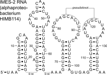 The IMES-2 RNA motif is a conserved RNA structure that was identified by a study based on metagenomics and bioinformatics,[1] and the underlying RNA sequences were identified independently by a similar earlier study.[2] These RNAs are present in environmental sequences, and when discovered were not known to be present in any cultivated species. However, an IMES-2 RNA has been detected in alphaproteobacterium HIMB114, which is classified in the SAR11 clade of marine bacteria. This finding fits with earlier predictions that species that use IMES-2 RNAs are most closely related to alphaproteobacteria.[2] IMES-2 RNAs are exceptionally abundant, as twice as many IMES-2 RNAs were found as ribosomes[1] in RNAs sampled from the Pacific Ocean.[2][3] Only two bacterial RNAs are known (6S RNA and transfer RNA) to be more highly transcribed than ribosomes.