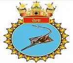 The submarine inherits its name from INS Vela (S40) which served in the Navy from 1973–2010, and was the lead ship of the Vela-class. The crew of the INS Vela (S40) was present at the commissioning ceremony of the INS Vela (S24).[17] Vela is the name of an Indian fish from the stingray species known for its aggression and offensive power, and the ability to camouflage itself from predators.[18] The submarine's crest depicts the stingray swimming across the blue seas.[15] The ship's mascot is a sub-ray, a portmanteau of submarine and stingray.[18] The mascot symbolises the "metamorphosis of the submarine’s character with the qualities of a stingray".[15]