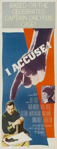I Accuse! is a British-American 1958 CinemaScope biographical drama film directed by and starring José Ferrer. The film is based on the true story of the Dreyfus Case, in which a Jewish captain in the French Army was falsely accused of treason.
