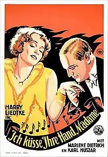 I Kiss Your Hand, Madame (German: Ich küsse Ihre Hand, Madame) is a 1929 German drama film directed by Robert Land starring Harry Liedtke and Marlene Dietrich.[1] It was released in the United States in 1932. It was produced by Super-Film. There is no dialogue in the original version of this film, which was silent, apart from the title-song by Ralph Erwin, writing by Fritz Rotter, that had been specially recorded by Richard Tauber to be played during the screening. Tauber himself does not actually appear in the film.