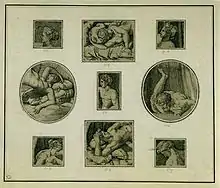 The original edition was created by the engraver Marcantonio Raimondi, basing his sixteen images of sexual positions on, according to the traditional view, a series of erotic paintings that Giulio Romano was doing as a commission for Federico II Gonzaga’s new Palazzo Te in Mantua.[3] Marcantonio had worked extensively with Romano's master Raphael, who had died in 1520, producing prints to his design. The engravings were published by Marcantonio in 1524, and led to his imprisonment by Pope Clement VII and the destruction of all copies of the illustrations. Romano did not become aware of the engravings until the poet Pietro Aretino came to see the original paintings while Romano was still working on them. Romano was not prosecuted since—unlike Marcantonio—his images were not intended for public consumption. Aretino then composed sixteen explicit[4] sonnets to accompany the paintings/engravings, and secured Marcantonio's release from prison.