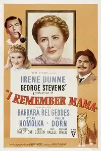 I Remember Mama is a 1948 American drama film directed by George Stevens from a screenplay by DeWitt Bodeen, whose work was adapted from John Van Druten's stage play. Druten, in turn, had based his play on Kathryn Forbes' novel Mama's Bank Account, which was originally published by Harcourt Brace in 1943. The story in all its variant forms recounts the everyday life and economic struggles of a Norwegian immigrant family in San Francisco in the early 20th century. The film stars Irene Dunne as the mother, as well as Barbara Bel Geddes, Oscar Homolka, Ellen Corby and Philip Dorn. Homolka portrays Uncle Chris in the film, a role he had performed earlier in the Broadway production.