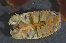 | Several orange-coloured specimens in the brood pouch of a larger isopod | |