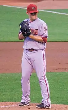On December 8, 2009, Kennedy was part of a three-team, seven-player trade with the Yankees, Arizona Diamondbacks, and Detroit Tigers. Kennedy, Phil Coke, and prospect Austin Jackson went from New York to Detroit in exchange for All-Star center fielder Curtis Granderson, with Kennedy then flipped to Arizona alongside Edwin Jackson so that the Tigers could acquire Diamondbacks pitchers Max Scherzer and Daniel Schlereth.[37] The Diamondbacks started showing interest in Kennedy when he pitched for the Arizona Fall League,[38] and he earned a position in the Arizona starting rotation by the end of March 2010.[39] The Diamondbacks' player development staff agreed at the start of the season to limit Kennedy's workload to a total of 180 innings, an amount that would help the pitcher extend his durability without pushing him into additional injuries.[40] Kennedy picked up his first win in over two years on April 29, pitching eight innings in the Diamondbacks' 13–5 rout of the Chicago Cubs. Kennedy was able to take a one-run game into the eighth inning before giving up a grand slam to Kosuke Fukudome, and Daniel Stange was called in to pitch a perfect ninth inning for his own MLB debut.[41] On August 26, Kennedy struck out a career-high 12 batters in an 11–5 victory over the San Diego Padres. He cited Arizona's early lead, in which they picked up nine runs in the first 3+1⁄3 innings, with helping him relax enough to maintain his command.[42] Kennedy finished his first full major league season with a 9–10 record and a 3.80 ERA in 32 starts, as well as 168 strikeouts in 194 innings. He also walked 70 batters and led MLB with 16 wild pitches.[43]