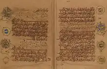 Apart from the use of paper, the Chester Beatty manuscript is notable for several innovations to Qur'anic calligraphy which heavily influenced the art for centuries. This paper Qur'an, unlike its parchment and vellum predecessors, was oriented vertically rather than horizontally.[9] Breaking from tradition, Ibn al-Bawwab's Qur'an does not use the Kufic script which dominated Islam's first three centuries, instead utilizing more legible cursive scripts. Naskh is used in the main text while the related thuluth script appears in the opening pages as well as the Sura headings and statistical pages containing verse-count. These statistical folios, which began to appear in the semi-Kufic Qur'ans preceding Ibn al-Bawwab, were here expanded to include additional information such as the total word and letter count of each Sura, the word count of the entire manuscript, and even the number of dotted and undotted letters.[10]