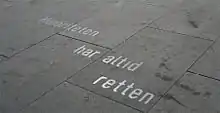 The initiative was taken by Sune Nordgren, inspired by a similar project involving August Strindberg quotes in Stockholm, Sweden. In 2001, Gavin Jantjes was appointed curator of the work. Sixty quotes in steel lettering were to be set into the sidewalks. The work was to be completed by 2006, the 100th anniversary of Henrik Ibsen's death.[1] As a result of delays, by 2006 only three quotes had been laid, at a cost of 1.7 million kr. The Swedish artist duo FA+ (Ingrid Falk and Gustavo Aguerre) had been selected to handle the quotes, but they resigned from the project in May 2006. NOK 400,000 came from the Arts Council Norway and the foundation that oversaw the 100th anniversary, but some of the funds were used for other causes. The group behind the project, the Ibsen Foundation, explained that in their view the money had not been specifically earmarked.[2]