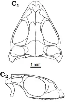 Icarosaurus (meaning "Icarus lizard") is an extinct genus of kuehneosaurid reptile from the Late Triassic (Norian age) Lower Lockatong Formation of New Jersey.[1] It is closely related to lizards and the tuatara. Based on a partial skeleton missing part of the tail, some ribs, a hand, and parts of the legs, it was a small animal, about 10 centimeters (4 in) long from the skull to the hips. Like its relative Kuehneosaurus, it was able to glide short distances using 'wings' consisting of highly elongated ribs covered with skin. These gliding membranes would have had a convex upper surface and a concave lower surface, thus creating a simple airfoil structure well-suited to gliding.[2][3][4] This method of gliding is also seen in Coelurosauravus and the modern Draco, neither of which are closely related to Icarosaurus.