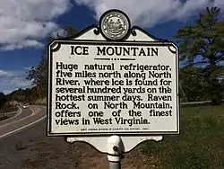 Ice Mountain earned its nicknames "Nature's Ice Box" and "Nature's Refrigerator" because of its use by Native Americans and early settlers for storage of perishable food items during the warmer months of the year.[4] During the American Civil War, Ice Mountain was used as a lookout point while the surrounding area served as the scene of numerous small skirmishes.[9][14] Thomas McMackin's Confederate militia company camped alongside North River at the base of Raven Rocks, where a sentinel was placed from daybreak to dusk.[7] Around the late 19th and early 20th centuries, North River Mills residents would celebrate Independence Day and other occasions as late as September by digging up ice from the talus for the making of ice cream and lemonade.[11][14]