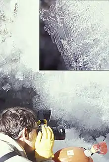 This type of cave was first formally described by Englishman Edwin Swift Balch in 1900,[1] who suggested the French term glacieres should be used for them, even though the term ice cave was then, as now, commonly used to refer to caves simply containing year-round ice. Among speleologists, ice cave is the proper English term.[2]