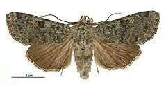 Primaries above greyish-green, with black costal spots indicating the origin of the usual lines; all the lines and spots black or blackish. margined either outwardly or inwardly with pale ochraceous; the discoidal spots and a spot below the orbicular indicated in outline; an oblique zigzag line from the reniform to the inner margin, followed by a subangulated series of lunate markings from costa to inner margin, an extradiscal series of ill-formed hastate subconfluent black spots parallel to the outer margin; fringe blackish towards the apex; secondaries sericeous grey with a feeble lilacine tint; a broad deep brownish grey external border; fringe yellowish at base, tipped with white and intersected by a grey line; thorax greyish-green, abdomen sordid whitish, sericeous; anus yellowish; under surface of wings silvery-greyish, the primaries with the costal and external borders finely white-speckled but not distinctly; an ochraceous tuft close to the base covering a bare and swollen space at the base of the costal vein; a slightly arched grey discal line; internal area white at base; secondaries paler than primaries; the fringe yellowish at base; an arched grey discal line; discocellulars greyish: body below sordid white. Expanse of wings 1 inch 10 lines.[3]