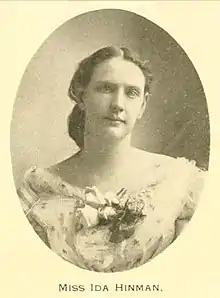Ida May Hinman was born in 1854 in Keokuk, Iowa. Sgt. Edward Hinman, the progenitor of the family in America, according to a late family tradition an officer of the bodyguard of Charles I of England, emigrated about 1650 and eventually settled in Stratford, Connecticut.[1] He fathered two sons, of whom the oldest was Hinman's family's ancestor. Hinman's father, Botsford B. Hinman, was for years a successful merchant in Keokuk. Her mother was Ellen Elizabeth Fithian (1821–1909).[2][3]