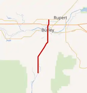 SH-27 begins in the town of Oakley and leaves the center of town on Center Street, heading due north. The highway makes a slight bend to the northeast before continuing north and entering the town of Burley as Overland Avenue. SH-27 intersects U.S. Route 30 (US 30) and runs concurrently with Interstate 84 Business (I-84 Bus.) as it leaves the town, heading north before turning northeast and intersecting I-84, where I-84 Business ends. The road continues north as 600 West Road, where it ends in the town of Paul at SH-25.[2][1]